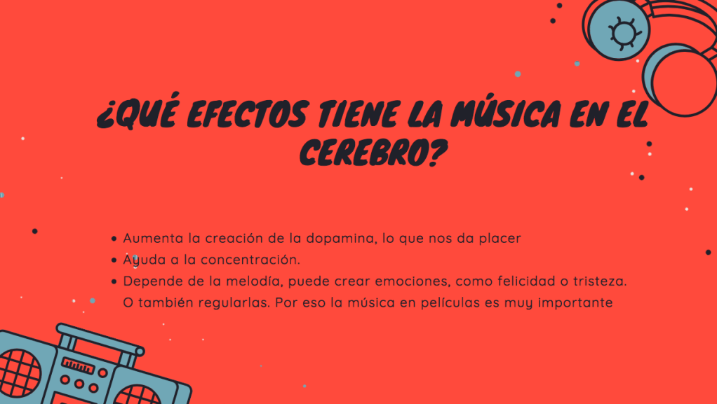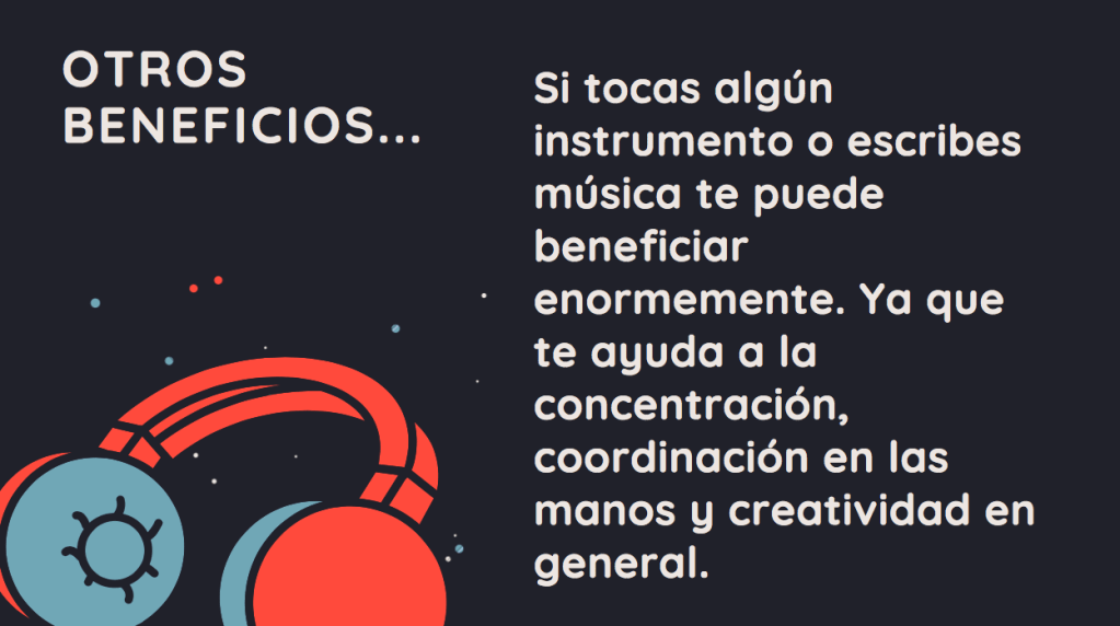 Muchas veces nos puede ayudar a encontrar aquella inspiración que buscamos. A veces la música puede sacar la mejor parte de nosotros en muchos ámbitos dependiendo del tipo de música que estemos escuchando; por ejemplo, puede ayudar a relajarnos, hacer los felices, etc.